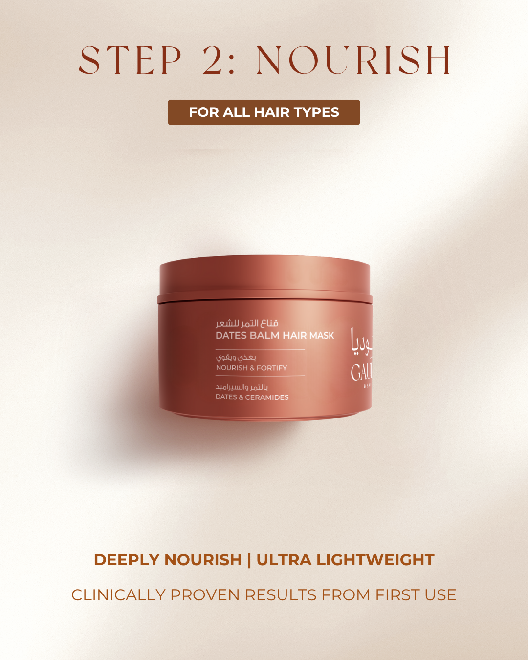 Discover a professional 3-steps ritual designed to promote healthier, fuller, and longer hair. This routine effectively treats the scalp, nourishes and repairs hair strands, and offers protection from external stresses.